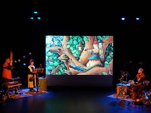 La lumière de la salle baisse lentement, dans la nuit étoilée. Sur scène, des instruments de musique étranges… Le son d’une flûte retentit, appel sensible au rêve et à l’imaginaire et les artistes apparaissent, au milieu des enfants, créant de leurs voix et de leurs instruments, les sons de la forêt…. Ils montent sur scène et le voyage commence en mots, en chanson, en musique et avec le film d’animation réalisé subtilement à partir des images de l’Arbre sans fin.